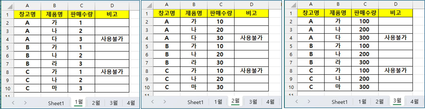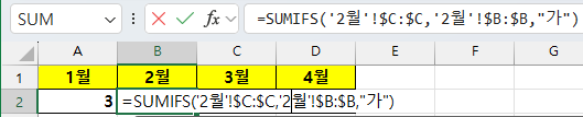 =SUMIFS('1월'!$C:$C,'1월'!$B:$B,"가") → =SUMIFS('2월'!$C:$C,'2월'!$B:$B,"가")