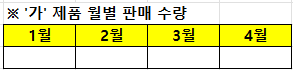 예를 들어 위의 표1에서 1월의 '가'제품 판매 수량을 취합한다면 아래와 같은 수식을 입력하시면 되겠습니다.