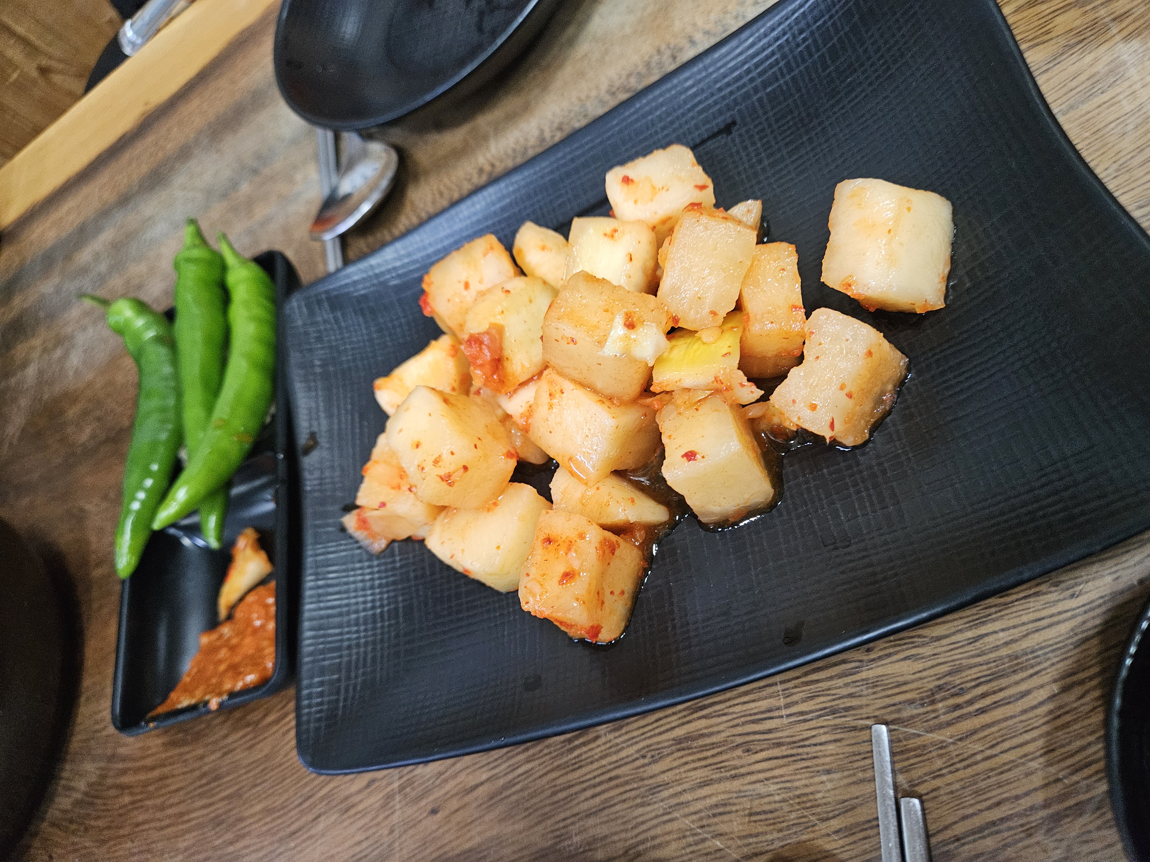 밑반찬으로 청양고추와 깍두기가 나오는데 깍두기가 순댓국과 잘 어울립니다.